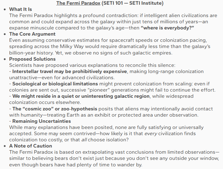 Apparently, it’s the big cosmic question of “Where is everybody?” If intelligent alien civilizations are so likely, and the galaxy is billions of years old, then why haven’t we seen any signs of them yet?
